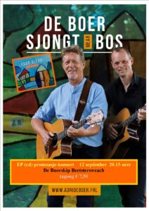 ‘De Boer sjongt mear Bos’ De Buorskip Beetsterzwaag 12 septimber 2025 Beetsterzwaag De Buorskip 12 septimber 2025 EP promotieconcert 'Foar Altyd' Add To Calendar Google Calendar iCal Venue Details De Buorskip Vlaslaan 26Beetsterzwaag